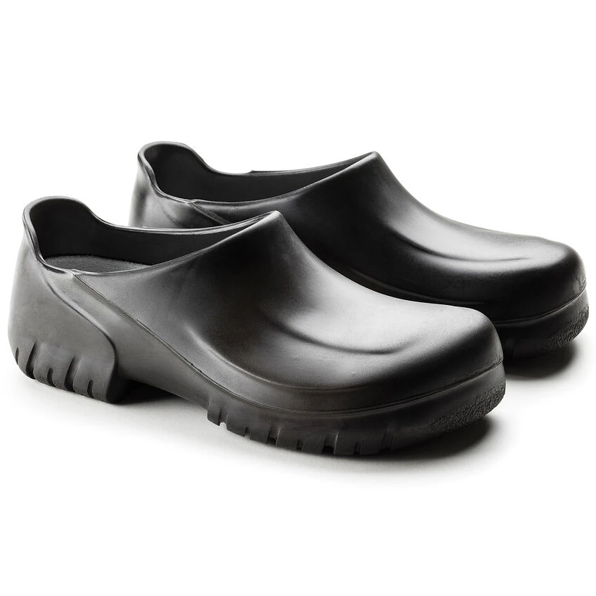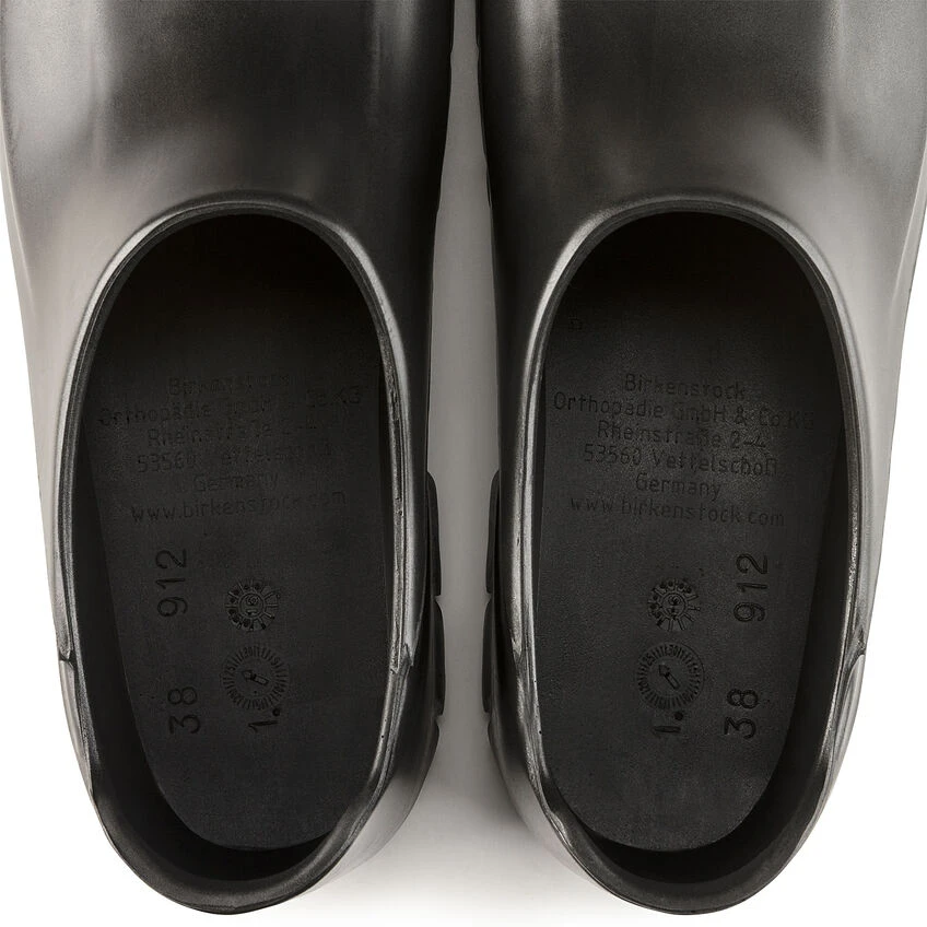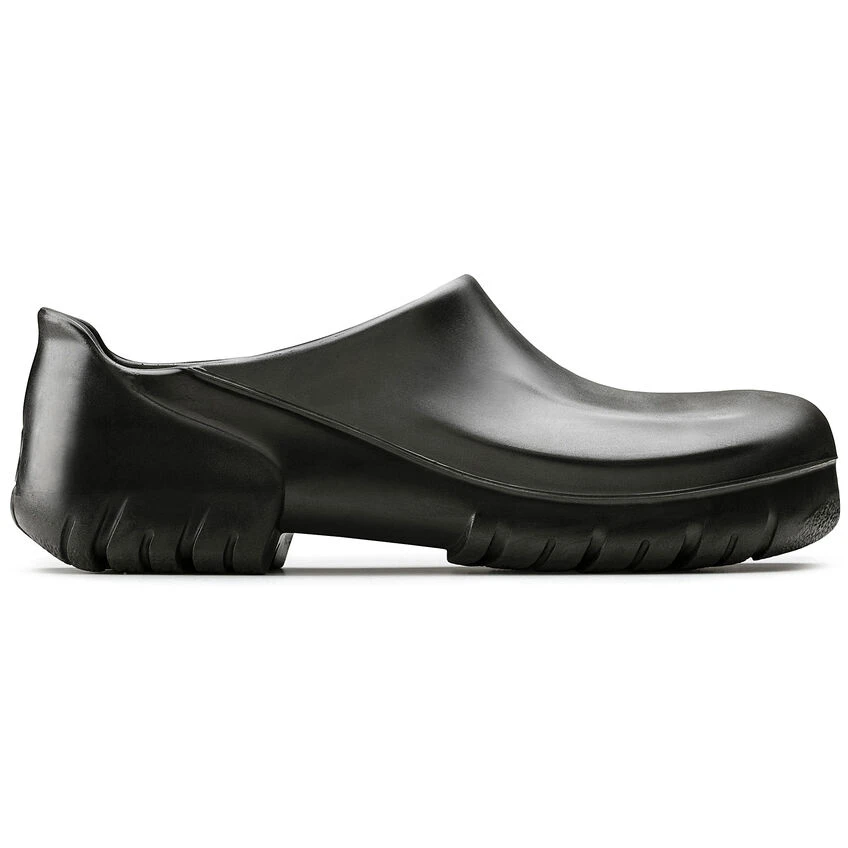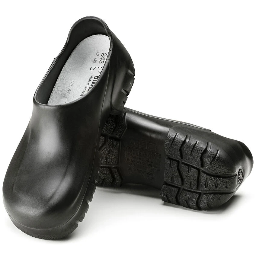 The A 640 PU clog covers all bases when it comes to stringent hygiene standards and reliable nonslip properties. Its enclosed design and the nonslip treaded sole offer reliable grip and maximum sure-footedness in kitchens and the food industry. Its solid steel toe cap protects toes and the front of the foot from impacts of up to 200 joules. Its oil- and grease-resistant material is also water-resistant, allowing it to be cleaned efficiently and thoroughly. This involves removing the cork-latex footbed and washing the clog at up to 80° Celsius. Both parts of the shoe are suitable for daily disinfection. The anatomically shaped original BIRKENSTOCK footbed protects joints and tendons, and is also washable at up to 30° Celsius. The footbed is available separately and can therefore be replaced if necessary. The A 640 model is certified in accordance with EN ISO 20345:2011 SB E (SRC category).