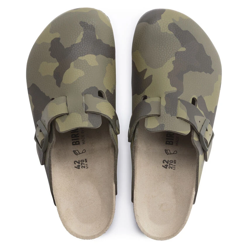 The BIRKENSTOCK Boston clog is the perfect shoe for year round wear. This shoe features tone-on-tone which gives it a trendy camouflage look as well as color-coordinated buckles for a stylish addition. The upper is made from the skin-friendly, hard-wearing synthetic material Birko-Flor®