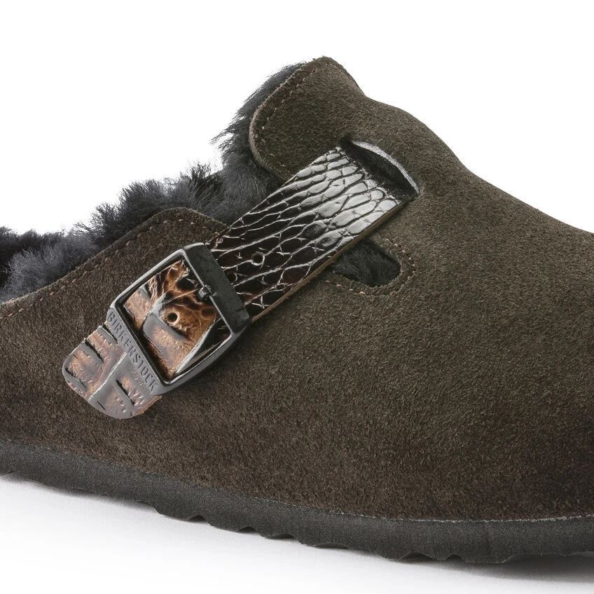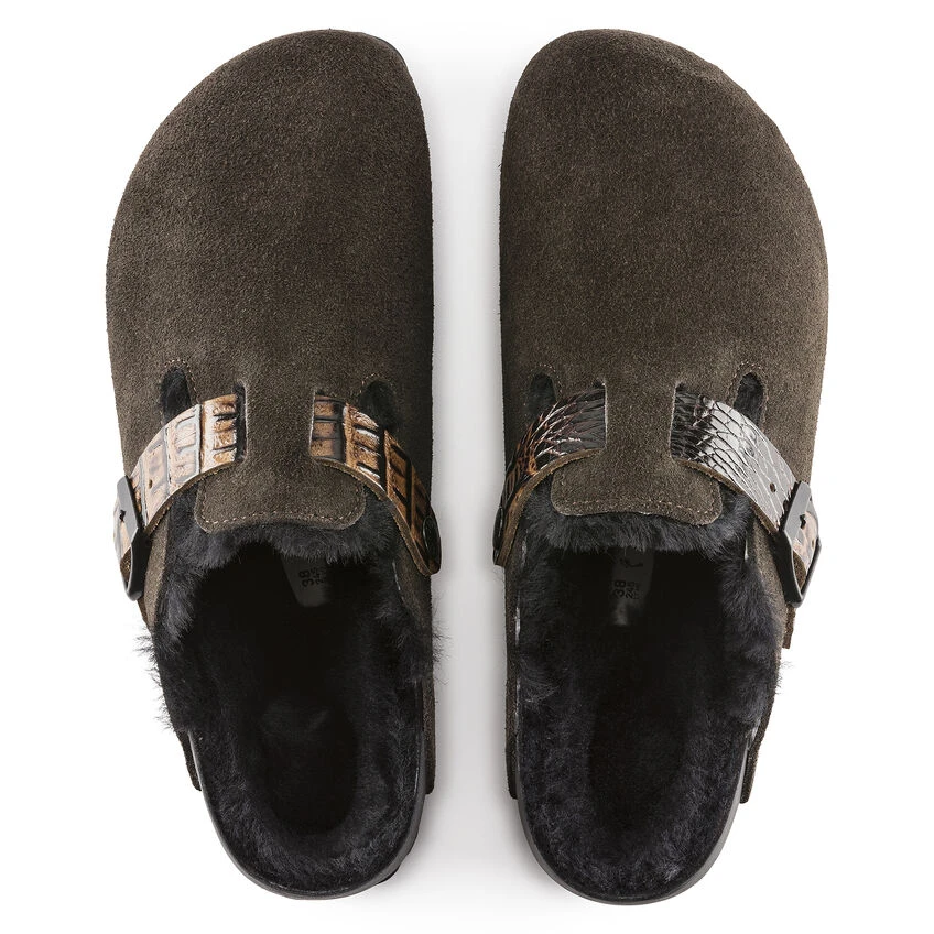 Our classic Boston silhouette gets an elevated yet cozy make over. The upper features our super soft suede complimented by a tonal reptile embossed strap, while the footbed exterior is wrapped in premium smooth black leather for added elegance. Both the upper and the footbed are fully lined in genuine shearling creating both a cozy and fashionable look.