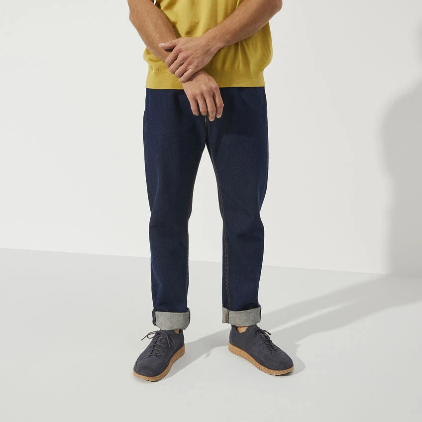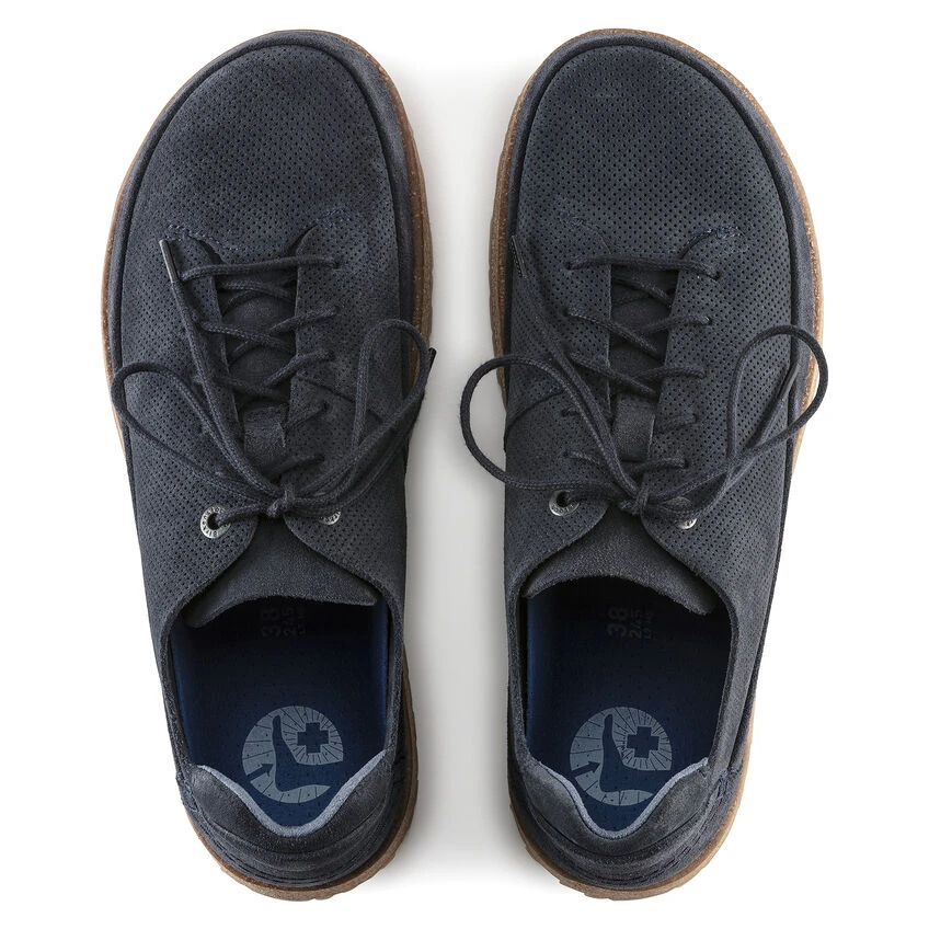 Introducing the BIRKENSTOCK Honnef – our newest street smart shoe engineered completely around our new Deep Blue footbed. The four part footbed includes a moisture wicking microfiber liner, cork and jute layers for optimum arch support and a PU base for added shock absorption and forefoot cushioning. The sporty lace up style is perfect for your most active days whether thatβs all day around town or on your next travel adventure. The upper is made of perforated suede.