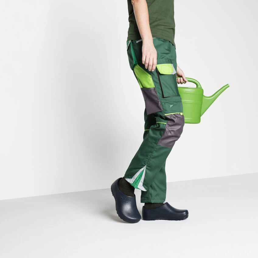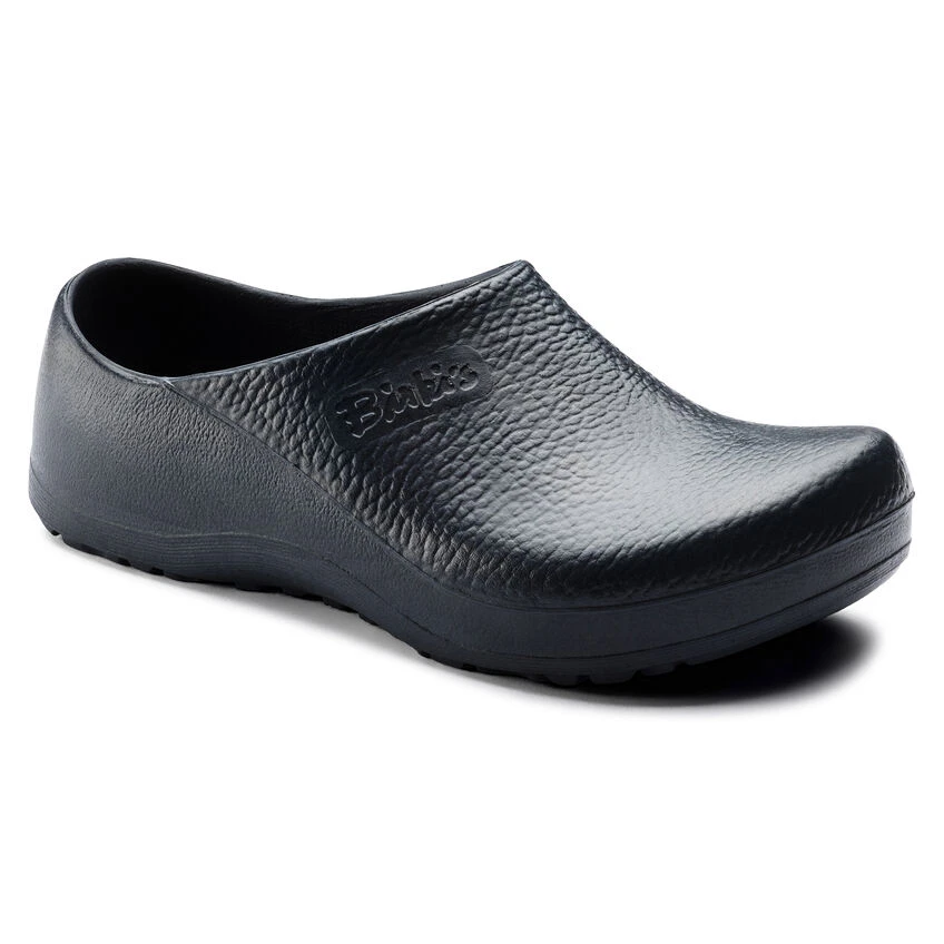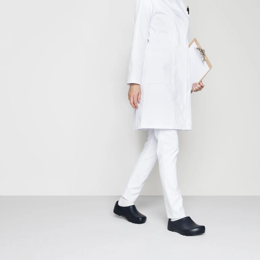 BIRKENSTOCK developed the Profi Birki to offer perfect grip and sure-footedness in almost any work environment. With its raised heel section and extended front, it encloses the entire foot and promotes a natural rolling motion with every step you take. The nonslip PU sole proves itself to be the ideal solution on smooth floor surfaces in particular. The Profi Birki is a top choice among long-term employees in hospitals, the food industry, and kitchens. Its outstanding hygiene properties likewise attest to this: the oil- and grease-resistant clog is washable at up to 80° Celsius, while the removable PU footbed can be washed at up to 60° Celsius and can also be disinfected.